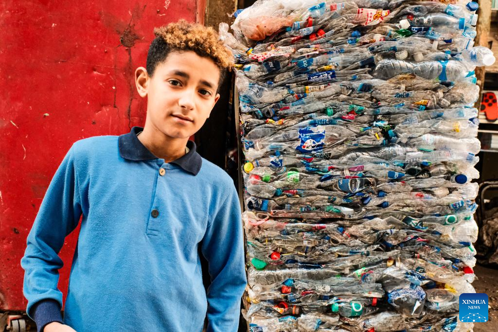 A child stands next to recycled empty plastic bottles at Manshiyat Naser, also known as Garbage City, in Cairo, Egypt, on April 21, 2026.(Xinhua/Xin Mengchen)