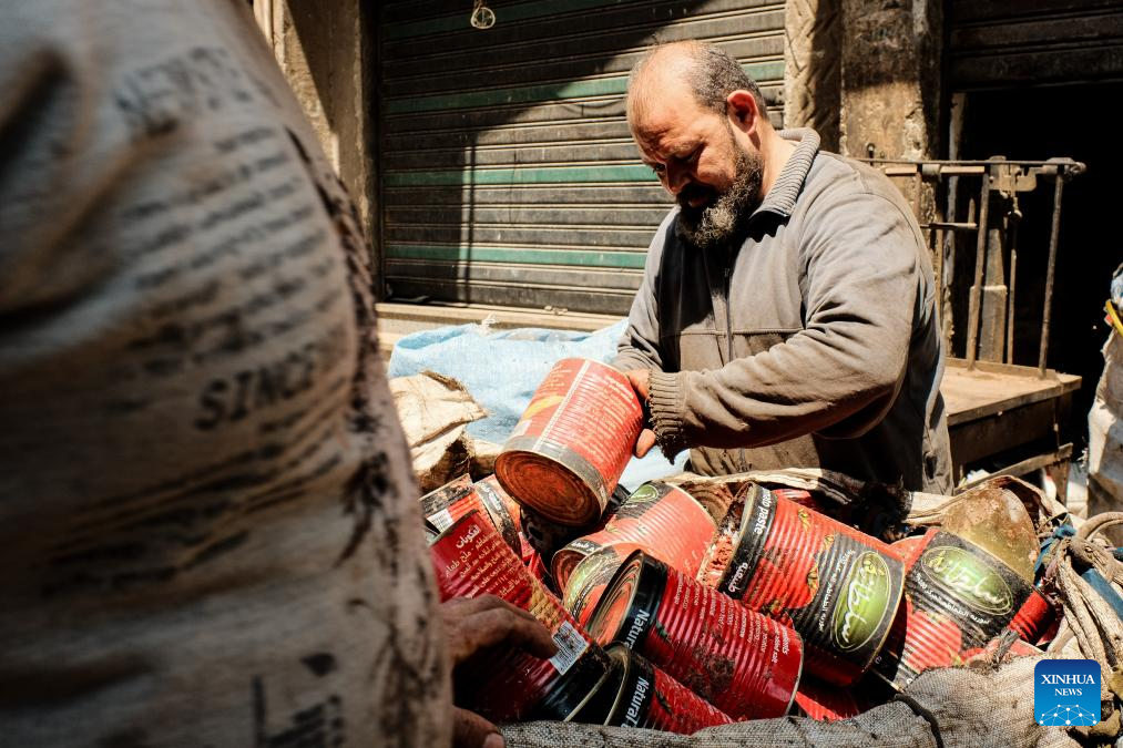 A man recycles empty cans at Manshiyat Naser, also known as Garbage City, in Cairo, Egypt, on April 21, 2026.(Xinhua/Xin Mengchen)