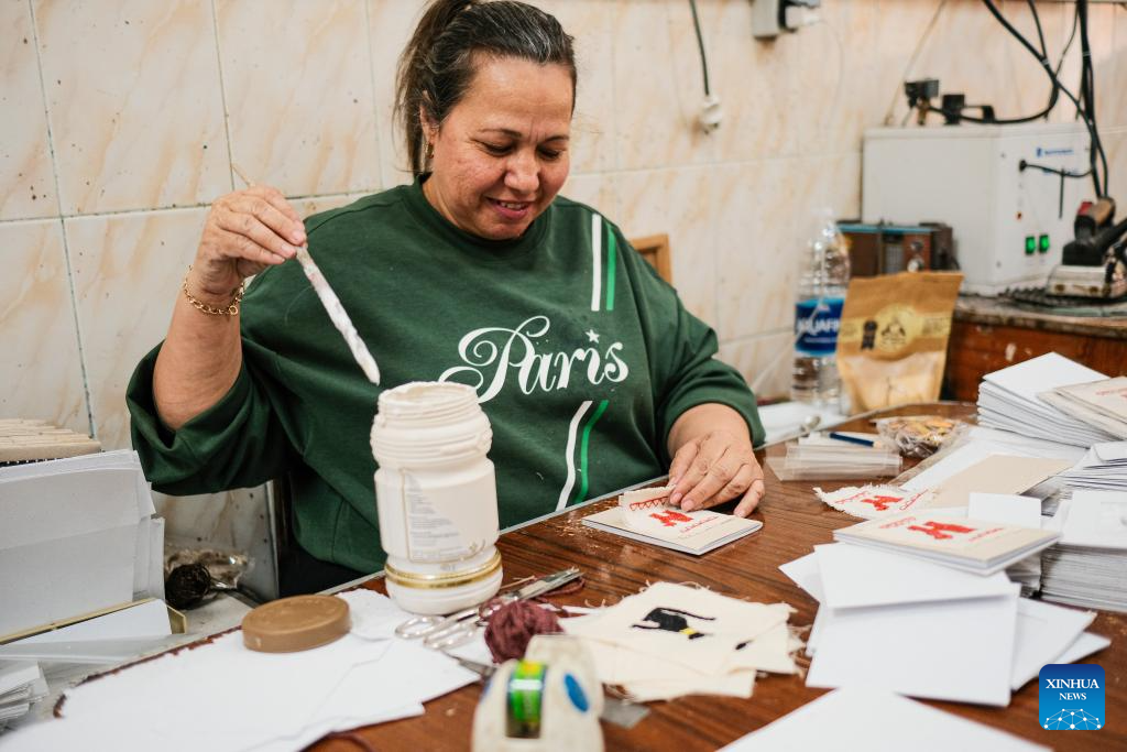 A worker makes a notebook using waste fabric at a workshop in Manshiyat Naser, also known as Garbage City, in Cairo, Egypt, on April 21, 2026.(Xinhua/Xin Mengchen)