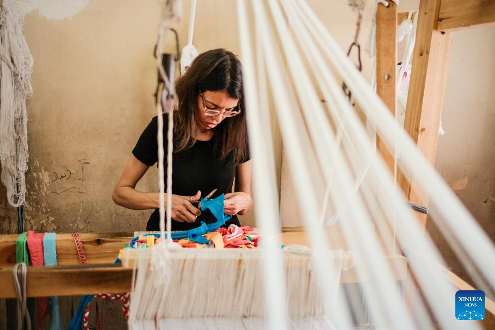 A worker makes a handbag from waste fabric at a workshop in Manshiyat Naser, also known as Garbage City, in Cairo, Egypt, on April 21, 2026.(Xinhua/Xin Mengchen)