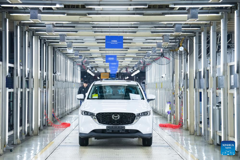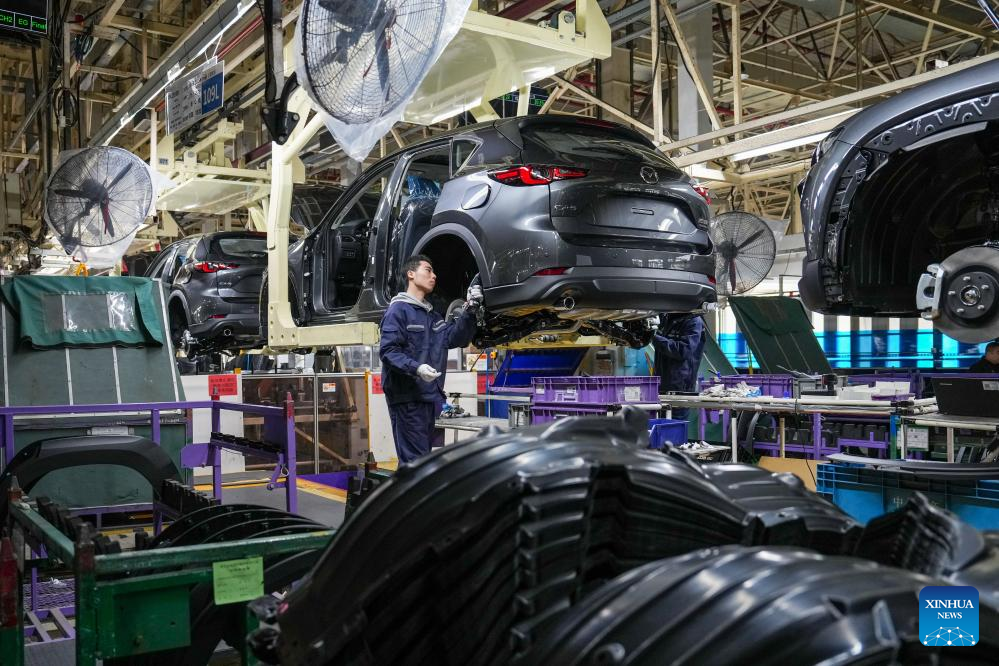 Staff members work on a production line at a workshop of Changan Mazda in Nanjing, east China's Jiangsu Province, March 17, 2026. In recent years, Jiangsu has focused on developing new quality productive forces, pursuing high-end, intelligent and globalized development, using advanced manufacturing to power high-quality economic growth.