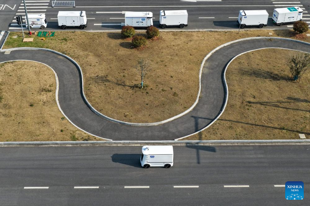 An aerial drone photo taken on March 25, 2026 shows an autonomous vehicle undergoing a test at Neolix, an autonomous vehicle manufacturer, in Yancheng, east China's Jiangsu Province. In recent years, Jiangsu has focused on developing new quality productive forces, pursuing high-end, intelligent and globalized development, using advanced manufacturing to power high-quality economic growth.