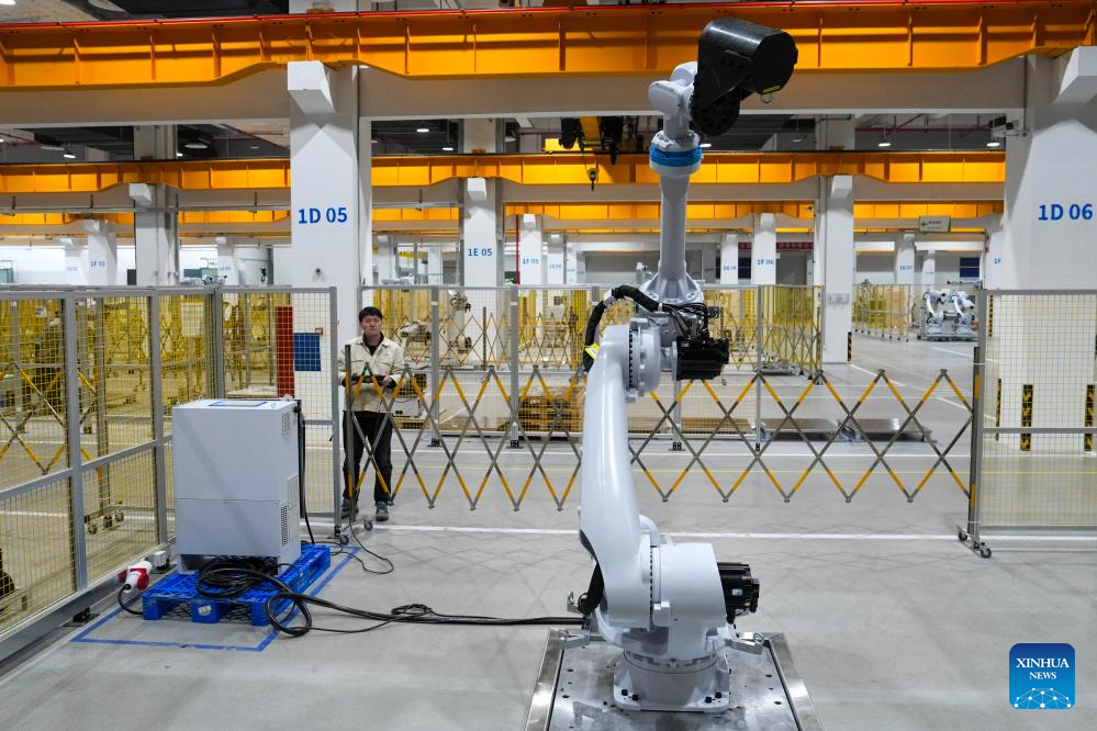 A robot is tested before its delivery in a workshop of Inovance in Jiangning economic development zone of Nanjing, east China's Jiangsu Province, on March 17, 2026. In recent years, Jiangsu has focused on developing new quality productive forces, pursuing high-end, intelligent and globalized development, using advanced manufacturing to power high-quality economic growth.