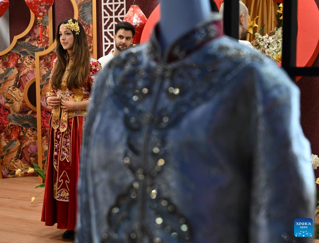 A woman tries on Chinese-style clothes at the event "Macao Night" in Madrid, Spain, April 21, 2026. Spain's capital city Madrid hosted the event "Macao Night" on Tuesday, organized by the Macao Government Tourism Office (MGTO), bringing together institutional representatives, industry professionals and local residents to showcase the Special Administrative Region (SAR)'s cultural offerings. (Xinhua/Cheng Min)