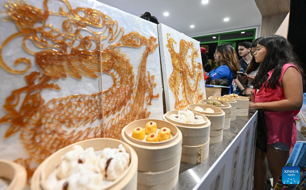 People look at syrup art works at the event "Macao Night" in Madrid, Spain, April 21, 2026. Spain's capital city Madrid hosted the event "Macao Night" on Tuesday, organized by the Macao Government Tourism Office (MGTO), bringing together institutional representatives, industry professionals and local residents to showcase the Special Administrative Region (SAR)'s cultural offerings. (Xinhua/Cheng Min)