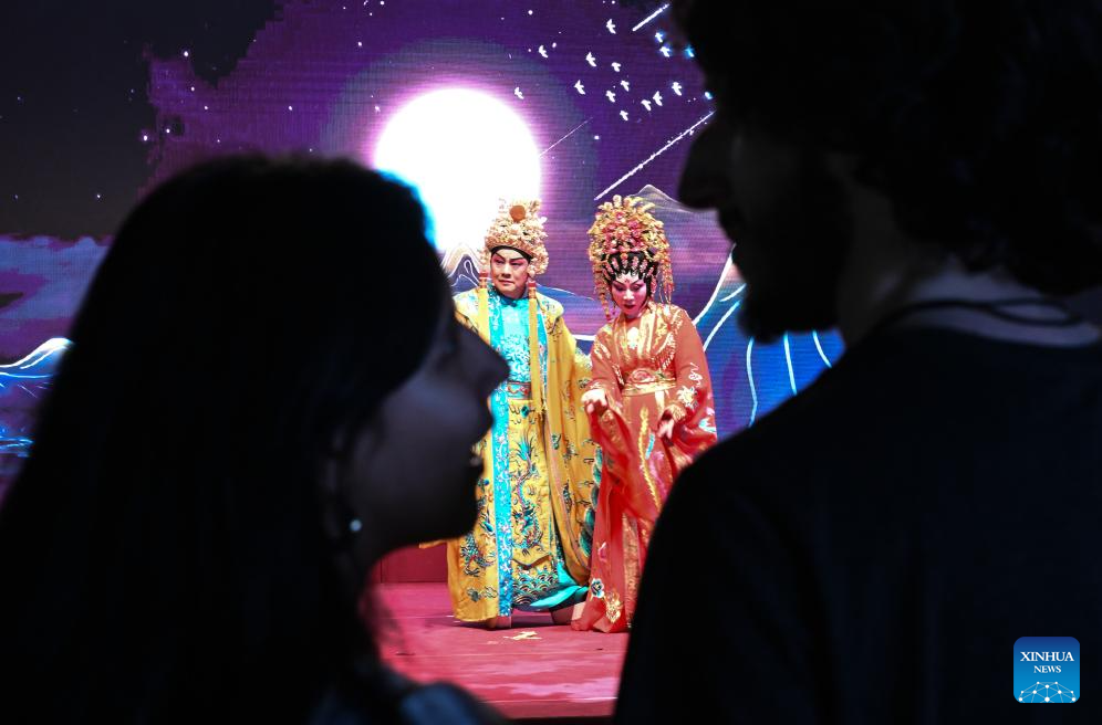 People enjoy a Chinese opera performance at the event "Macao Night" in Madrid, Spain, April 21, 2026. Spain's capital city Madrid hosted the event "Macao Night" on Tuesday, organized by the Macao Government Tourism Office (MGTO), bringing together institutional representatives, industry professionals and local residents to showcase the Special Administrative Region (SAR)'s cultural offerings. (Xinhua/Cheng Min)