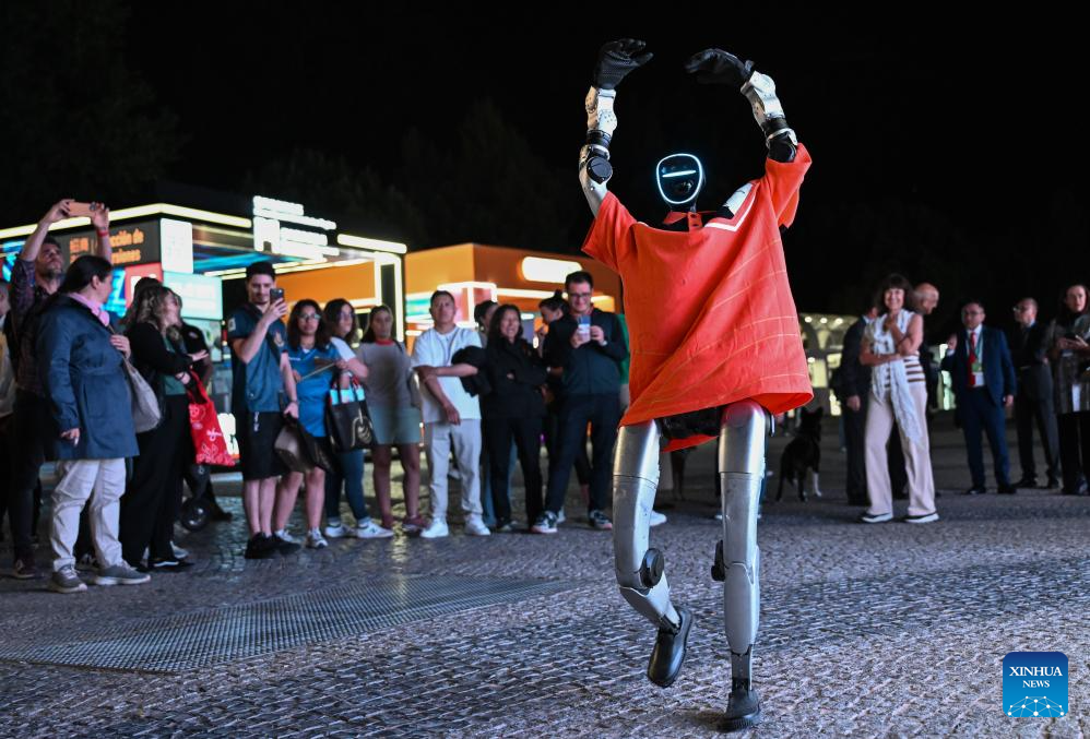 People watch a robot performing at the event "Macao Night" in Madrid, Spain, April 21, 2026. Spain's capital city Madrid hosted the event "Macao Night" on Tuesday, organized by the Macao Government Tourism Office (MGTO), bringing together institutional representatives, industry professionals and local residents to showcase the Special Administrative Region (SAR)'s cultural offerings. (Xinhua/Cheng Min)