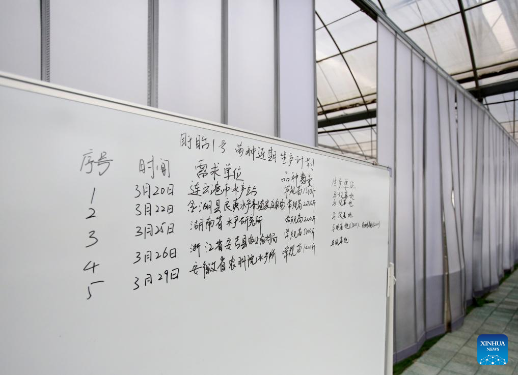 This photo taken on March 27, 2026 shows the production schedule written on a board outside a workshop of a modern agriculture demonstration base for Xuyi crayfish in Xuyi County, east China's Jiangsu Province. A modern agriculture demonstration base for the Xuyi crayfish industry is located in Maba Town of Xuyi County, covering an area of 1,200 mu (80 hectares). With a total investment of 18 million yuan (about 2.639 million U.S. dollars), the demonstration base, formerly a rice-crayfish co-culture base, has been transformed into a seedling breeding center, a standardized rice-crayfish farming base, and a facility for digital agriculture and water-saving irrigation.
