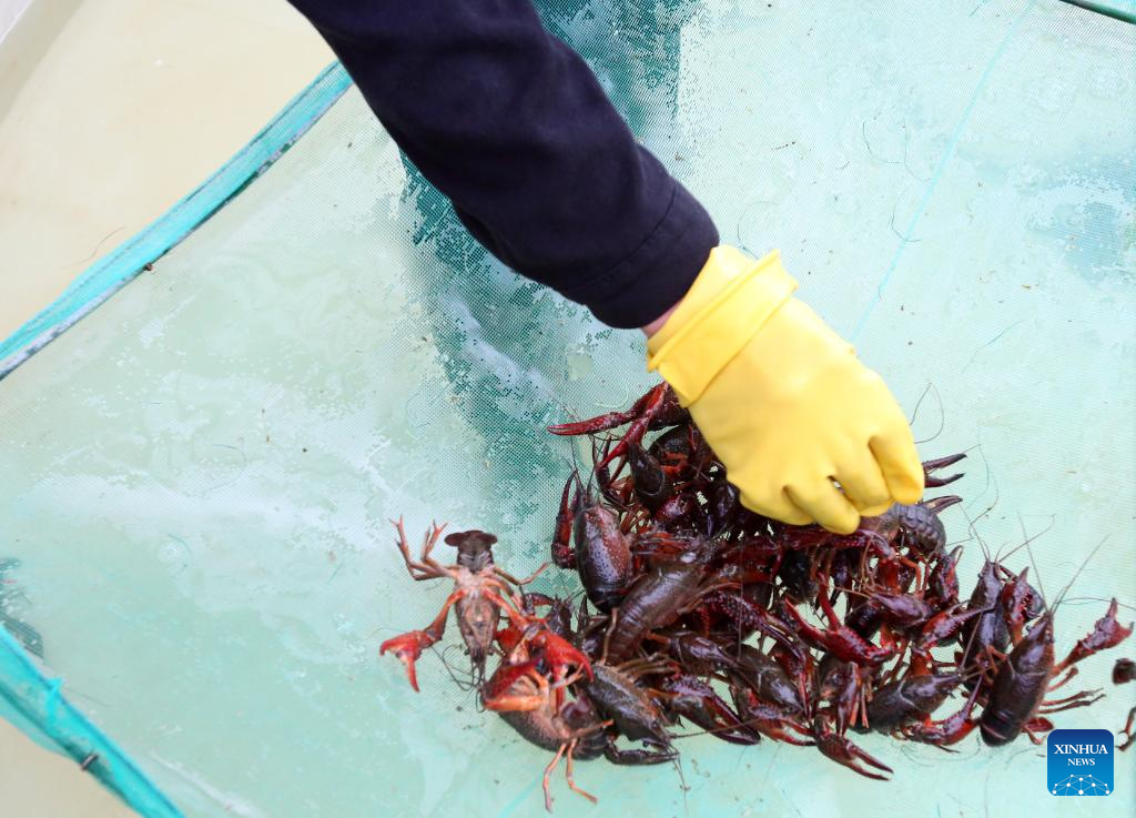A farmer catches crayfish at a breeding base in Huanghuatang Town of Xuyi County, east China's Jiangsu Province, in December 2025. A modern agriculture demonstration base for the Xuyi crayfish industry is located in Maba Town of Xuyi County, covering an area of 1,200 mu (80 hectares). With a total investment of 18 million yuan (about 2.639 million U.S. dollars), the demonstration base, formerly a rice-crayfish co-culture base, has been transformed into a seedling breeding center, a standardized rice-crayfish farming base, and a facility for digital agriculture and water-saving irrigation.
