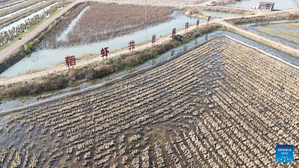 An aerial drone photo taken in December 2025 shows a rice-crayfish co-culture field in Huanghuatang Town of Xuyi County, east China's Jiangsu Province. A modern agriculture demonstration base for the Xuyi crayfish industry is located in Maba Town of Xuyi County, covering an area of 1,200 mu (80 hectares). With a total investment of 18 million yuan (about 2.639 million U.S. dollars), the demonstration base, formerly a rice-crayfish co-culture base, has been transformed into a seedling breeding center, a standardized rice-crayfish farming base, and a facility for digital agriculture and water-saving irrigation.