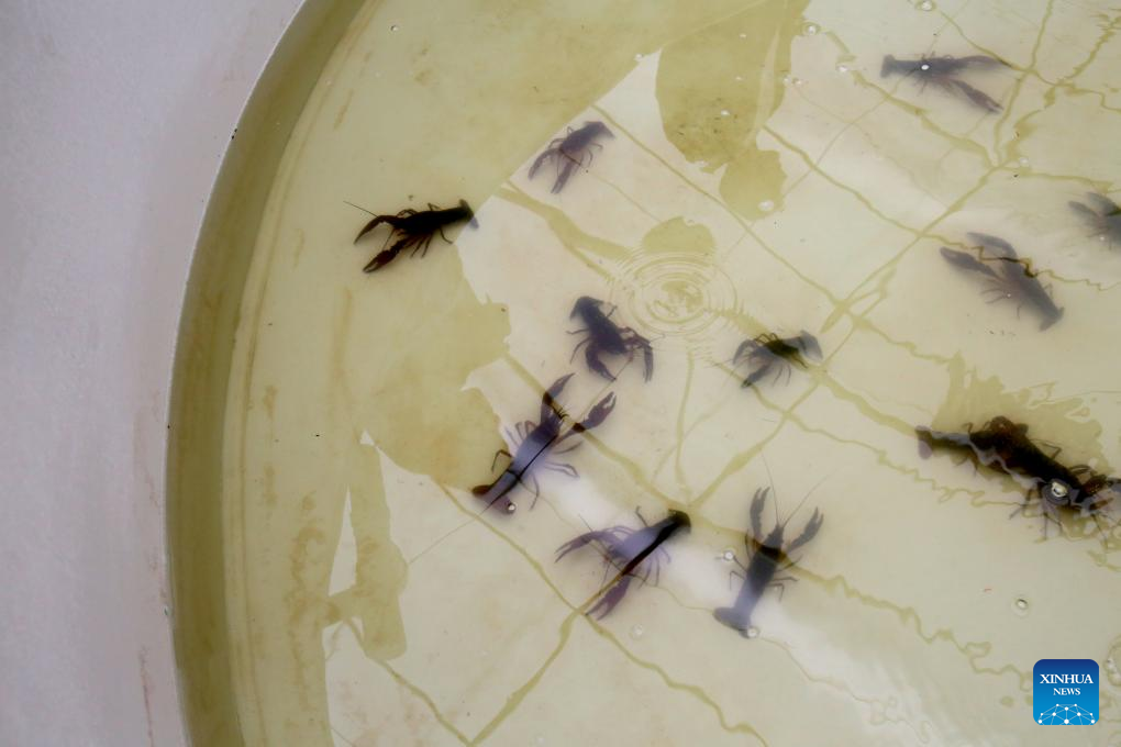 Crayfish are pictured at a modern agriculture demonstration base for Xuyi crayfish in Xuyi County, east China's Jiangsu Province, March 27, 2026. A modern agriculture demonstration base for the Xuyi crayfish industry is located in Maba Town of Xuyi County, covering an area of 1,200 mu (80 hectares). With a total investment of 18 million yuan (about 2.639 million U.S. dollars), the demonstration base, formerly a rice-crayfish co-culture base, has been transformed into a seedling breeding center, a standardized rice-crayfish farming base, and a facility for digital agriculture and water-saving irrigation.