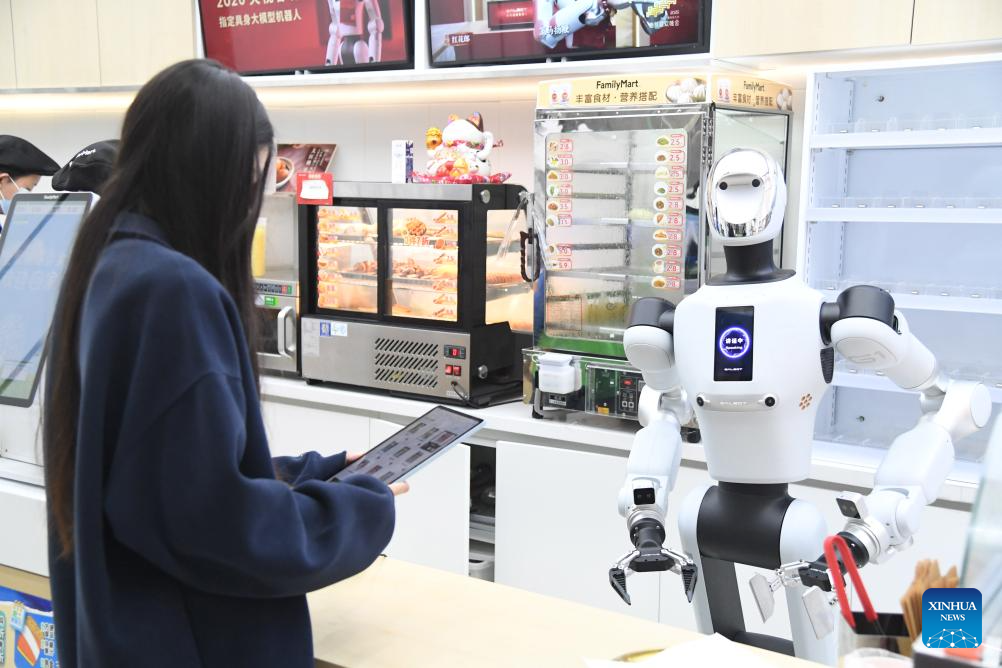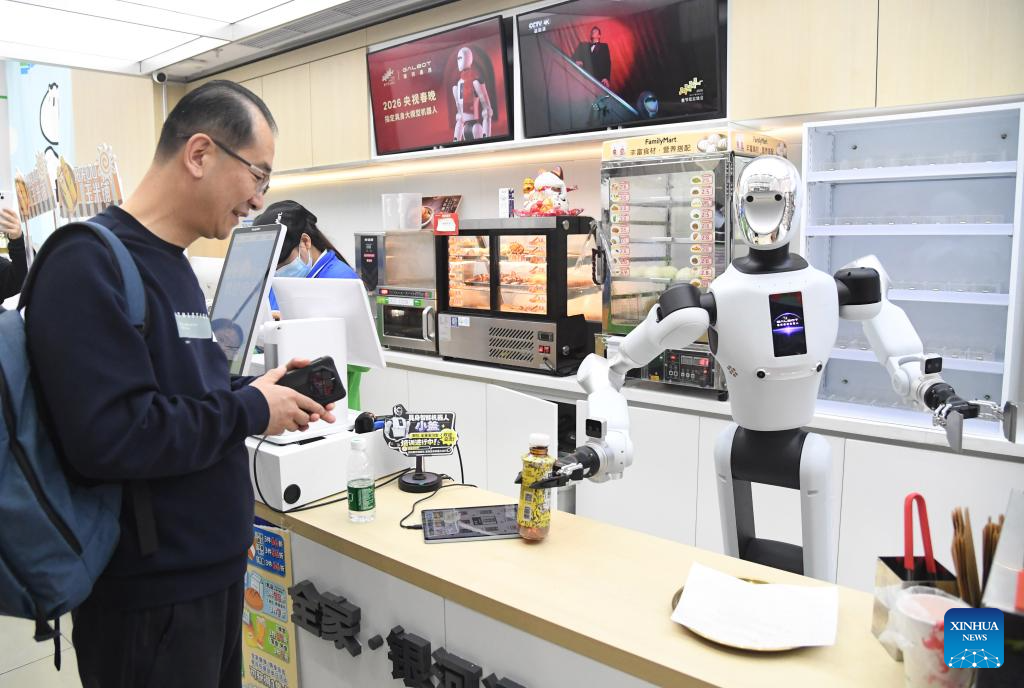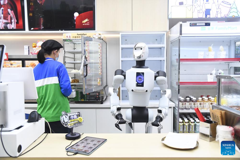 A humanoid robot works at a convenience store in Haidian District of Beijing, capital of China, April 22, 2026. An embodied large model robot has recently been deployed in a convenience store in Haidian District to provide regular service. The robot is responsible for greeting customers, answering product inquiries, providing promotion information, and delivering goods. (Xinhua/Ren Chao)