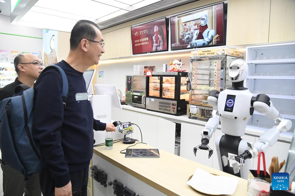 A humanoid robot grabs a grilled sausage at a convenience store in Haidian District of Beijing, capital of China, April 22, 2026. An embodied large model robot has recently been deployed in a convenience store in Haidian District to provide regular service. The robot is responsible for greeting customers, answering product inquiries, providing promotion information, and delivering goods. (Xinhua/Ren Chao)