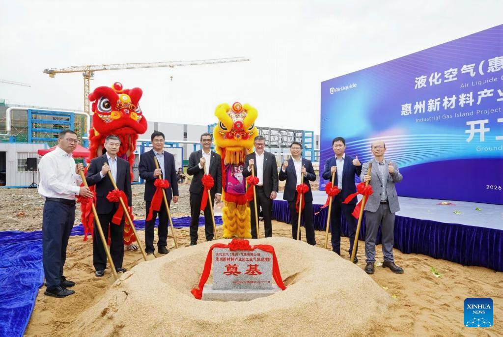 Guests attend the groundbreaking ceremony of a new air separation unit of Air Liquide in Huizhou, south China's Guangdong Province, April 21, 2026. French industrial gases giant Air Liquide broke ground on a new air separation unit in Huizhou, south China's Guangdong Province, on Tuesday, a project that will add 800 tonnes per day of liquid oxygen, nitrogen and argon supply to the Pearl River Delta market. (Air Liquide/Handout via Xinhua)