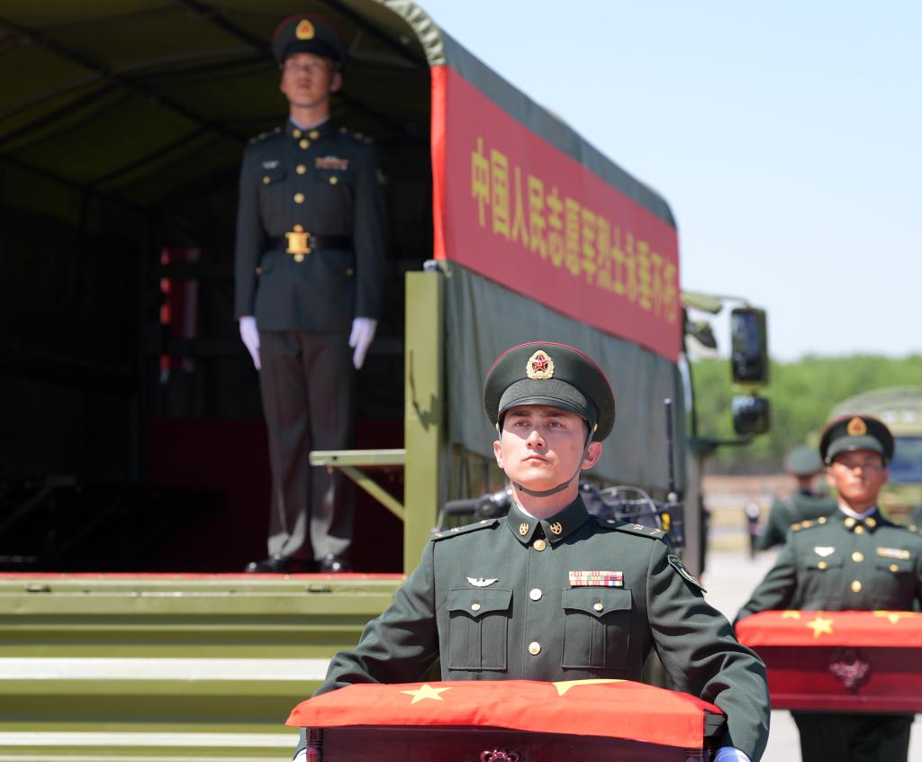 Coffins containing the remains of the Chinese People's Volunteers (CPV) martyrs, escorted by honor guards, arrives at the CPV martyrs' cemetery in Shenyang, northeast China's Liaoning Province, April 22, 2026. The remains of 12 Chinese People's Volunteers (CPV) martyrs who lost their lives during the War to Resist U.S. Aggression and Aid Korea (1950-1953) were returned to China from the Republic of Korea (ROK) on Wednesday.