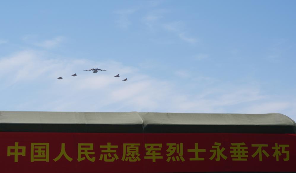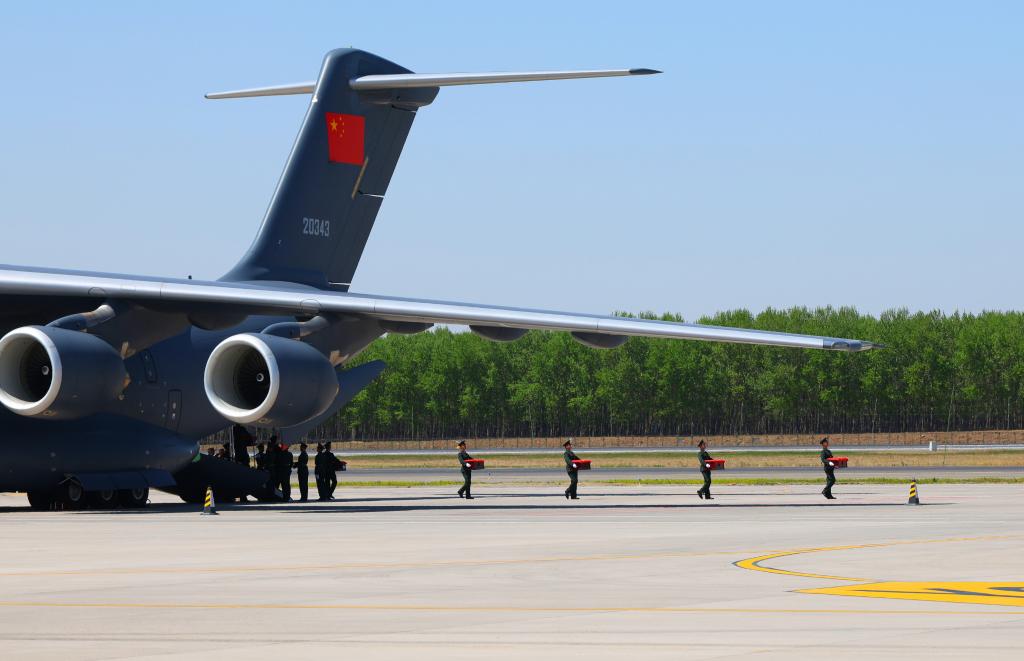 A Chinese Air Force Y-20B large transport aircraft carrying the remains of the fallen soldiers and 146 of their personal effects landed at Taoxian International Airport in Shenyang, capital of northeast China's Liaoning Province. After it entered China's airspace, the Y-20B transport aircraft was escorted by four J-20 fighter jets. (Xinhua/Yang Qing)