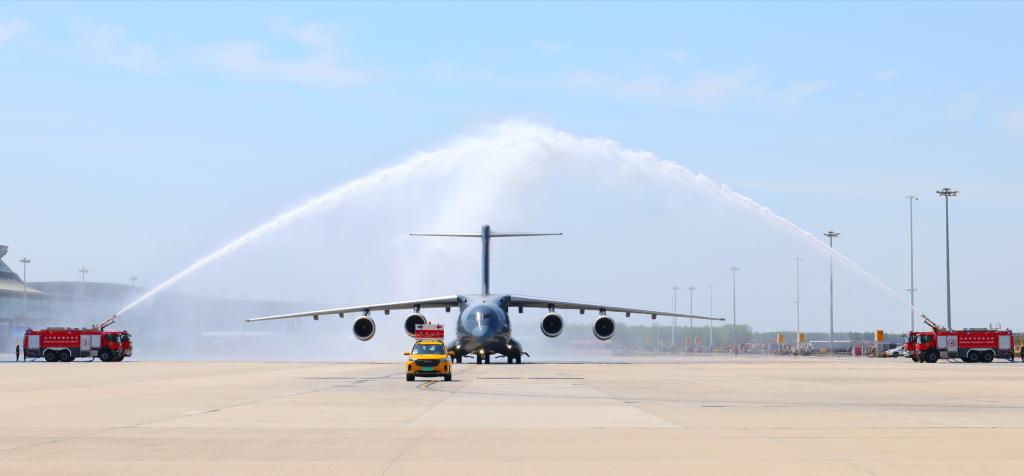 A Chinese Air Force Y-20B large transport aircraft carrying the remains of the Chinese People's Volunteers martyrs is welcomed by a water cannon salute upon arrival at Taoxian International Airport in Shenyang, northeast China's Liaoning Province, April 22, 2026. The remains of 12 Chinese People's Volunteers (CPV) martyrs who lost their lives during the War to Resist U.S. Aggression and Aid Korea (1950-1953) were returned to China from the Republic of Korea (ROK) on Wednesday.
