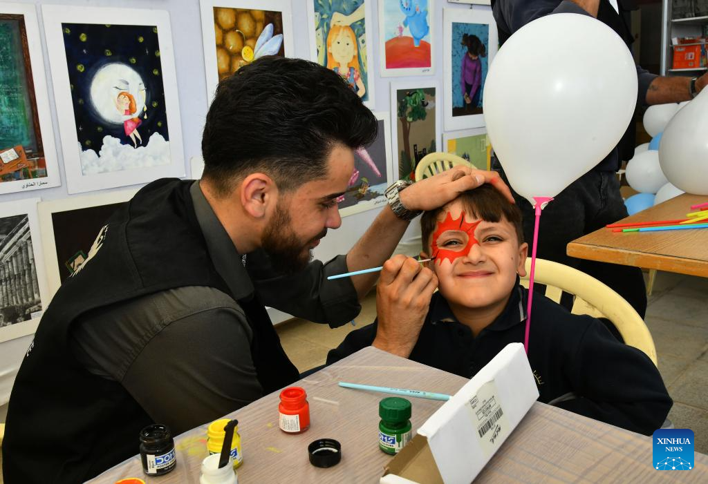 A Syrian child gets his face painted at a book fair at the National Library in Damascus, Syria, April 21, 2026. A book fair featuring activities such as group reading, chess, and painting was held here on Tuesday, aiming to promote reading and cultural awareness among the younger generation. (Photo by Ammar Safarjalani/Xinhua)