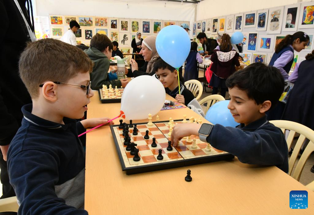 Syrian children play chess at a book fair at the National Library in Damascus, Syria, April 21, 2026. A book fair featuring activities such as group reading, chess, and painting was held here on Tuesday, aiming to promote reading and cultural awareness among the younger generation. (Photo by Ammar Safarjalani/Xinhua)