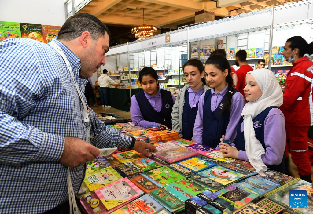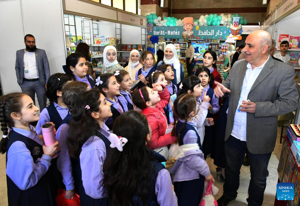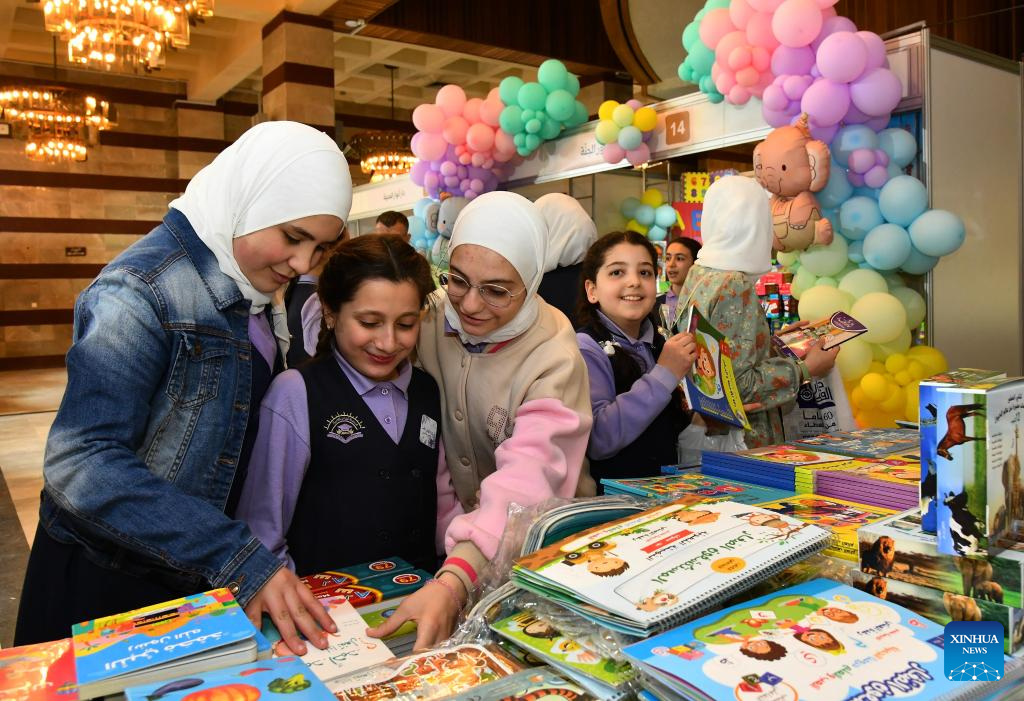 Syrian children attend a book fair at the National Library in Damascus, Syria, April 21, 2026. A book fair featuring activities such as group reading, chess, and painting was held here on Tuesday, aiming to promote reading and cultural awareness among the younger generation. (Photo by Ammar Safarjalani/Xinhua)
