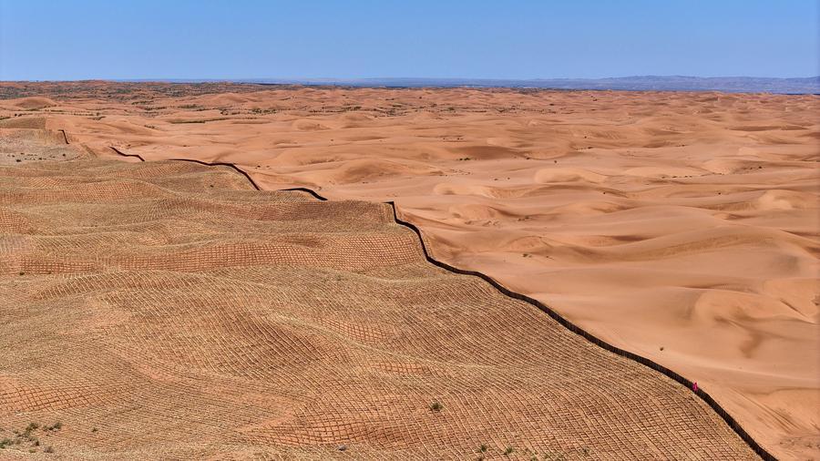 "We are reinforcing the windbreak and sand-blocking belt with a newly developed grass grid barrier. It is less labor-intensive than the traditional version, faster to install, and lasts longer -- five to six years," said Tang Ximing, a forestry engineer in Zhongwei, a city in Ningxia Hui Autonomous Region.