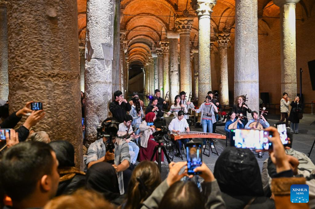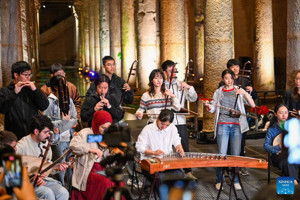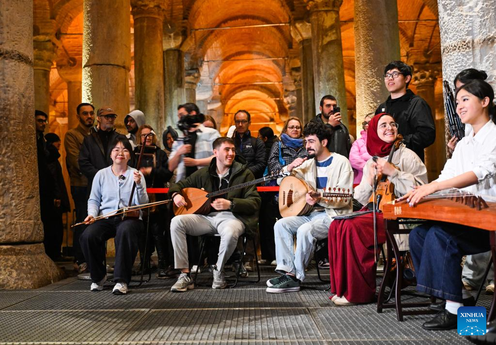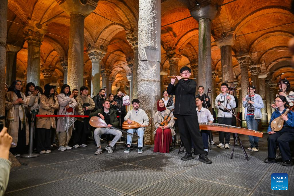 Members of the Nanjing University's traditional instrument orchestra from China and students of Bogazici University play during a flash mob performance of Chinese folk music at Basilica Cistern in Istanbul, Türkiye, April 22, 2026. Nanjing University's traditional instrument orchestra, in collaboration with the Confucius Institute at Bogazici University, staged a flash mob performance of Chinese folk music here on Wednesday, attracting many visitors. (Xinhua/Liu Lei)