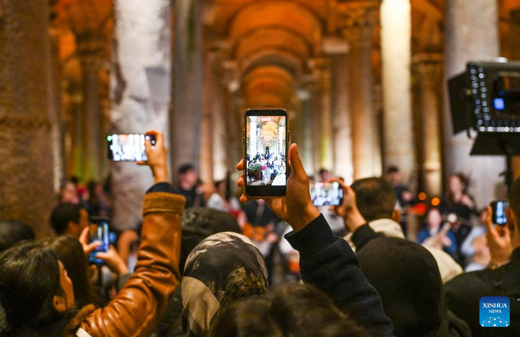 Visitors take photos of a flash mob performance of Chinese folk music at Basilica Cistern in Istanbul, Türkiye, April 22, 2026. Nanjing University's traditional instrument orchestra, in collaboration with the Confucius Institute at Bogazici University, staged a flash mob performance of Chinese folk music here on Wednesday, attracting many visitors. (Xinhua/Liu Lei)