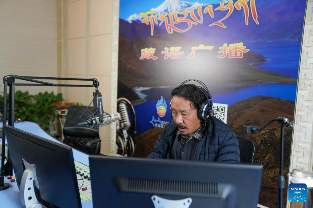 Punnor records a Tibetan language radio program in the recording studio of the regional people's broadcasting station in Lhasa, southwest China's Xizang Autonomous Region, April 1, 2025. (Xinhua/Jigme Dorje)