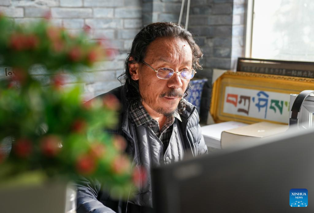 Punnor works in the office in the regional people's broadcasting station in Lhasa, southwest China's Xizang Autonomous Region, April 1, 2025. (Xinhua/Jigme Dorje)