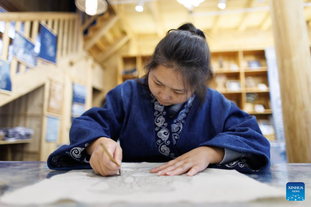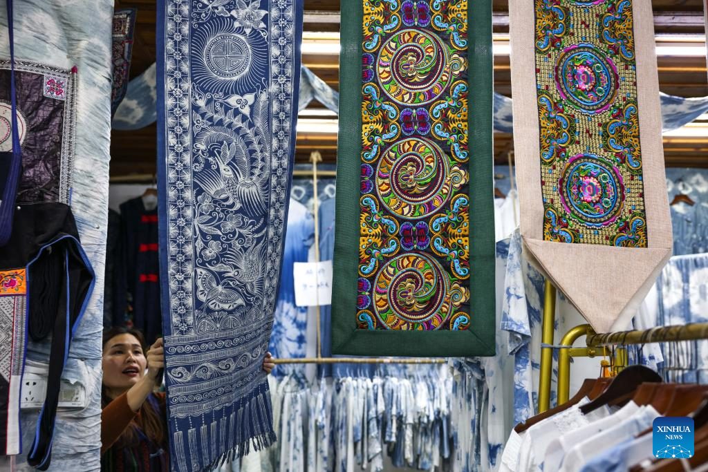 In Dong ethnic communities such as the Zhaoxing Dong Village, intangible cultural heritage skills like indigo dyeing and embroidery are an integral part of local culture. In recent years, through organizing cooperatives, providing skills training, and promoting brand development, these traditional crafts have made their way into the market, becoming a distinctive industry that boosts rural revitalization and improves local people's well-being. (Xinhua/Yang Wenbin)