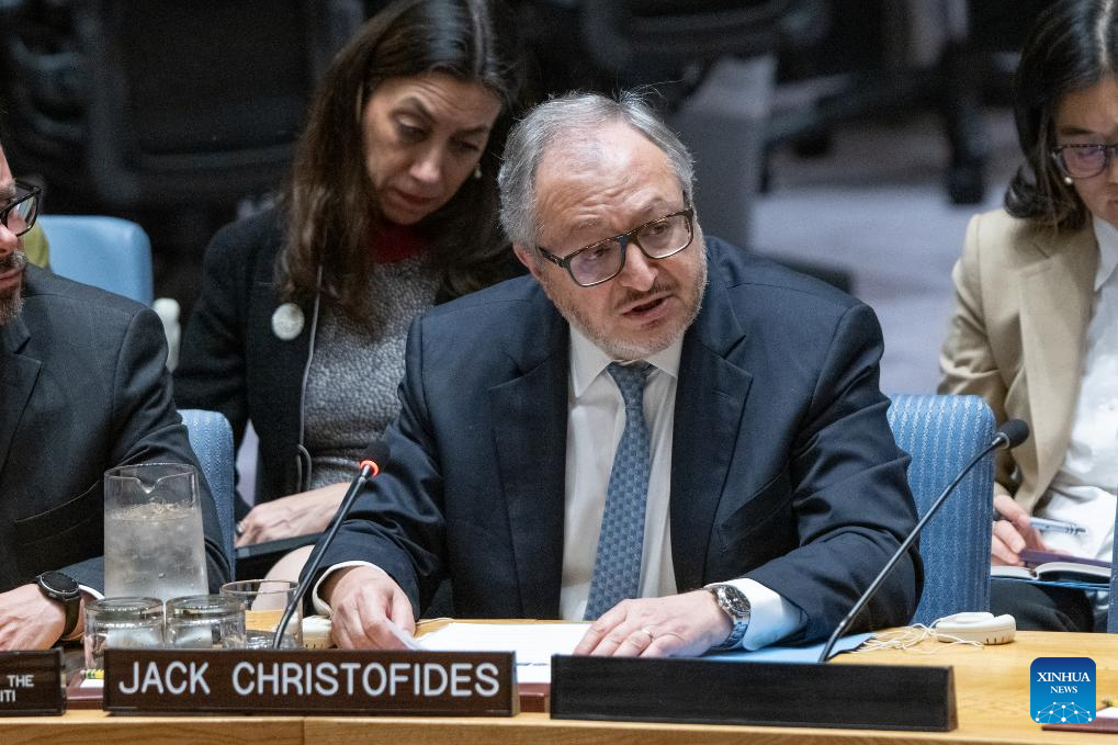 Jack Christofides (C), special representative for the Gang Suppression Force (GSF) in Haiti speaks at a Security Council meeting at the UN headquarters in New York, April 23, 2026. Christofides said Thursday that the force is in an early phase of establishment. (Eskinder Debebe/UN Photo/Handout via Xinhua)