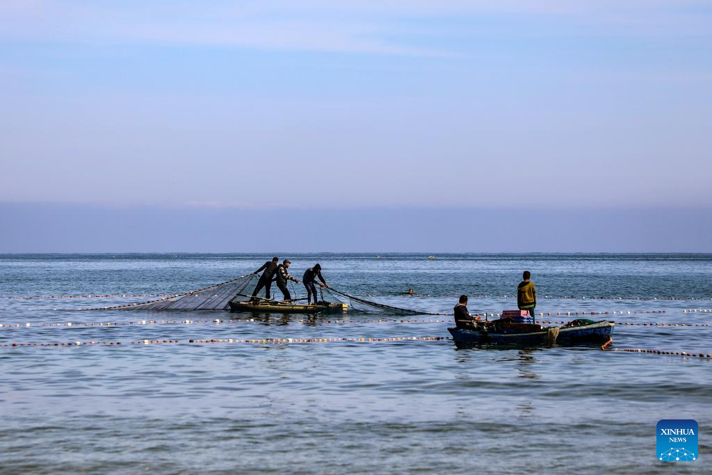Palestinian fishermen are seen fishing on their boats near the Gaza port in Gaza City, on April 24, 2026. (Photo by Rizek Abdeljawad/Xinhua)