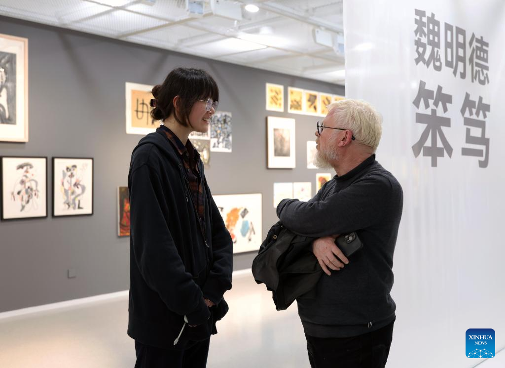 Benoît Vermander introduces his works at the site of his own exhibition at a museum in Fudan University, east China's Shanghai, April 22, 2026. (Xinhua/Liu Ying)