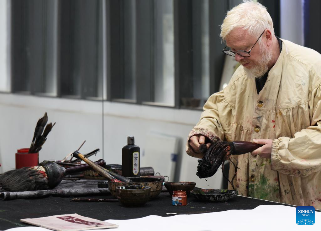 Benoît Vermander prepares brushes for paiting at a studio in Shanghai, east China, April 22, 2026. (Xinhua/Liu Ying)
