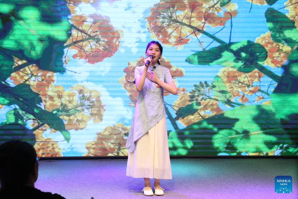 A student competes during a Chinese language recitation competition at the China Cultural Center in Yangon, Myanmar, April 26, 2026. (Photo by Soe Pyae Tun/Xinhua)