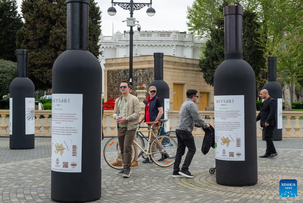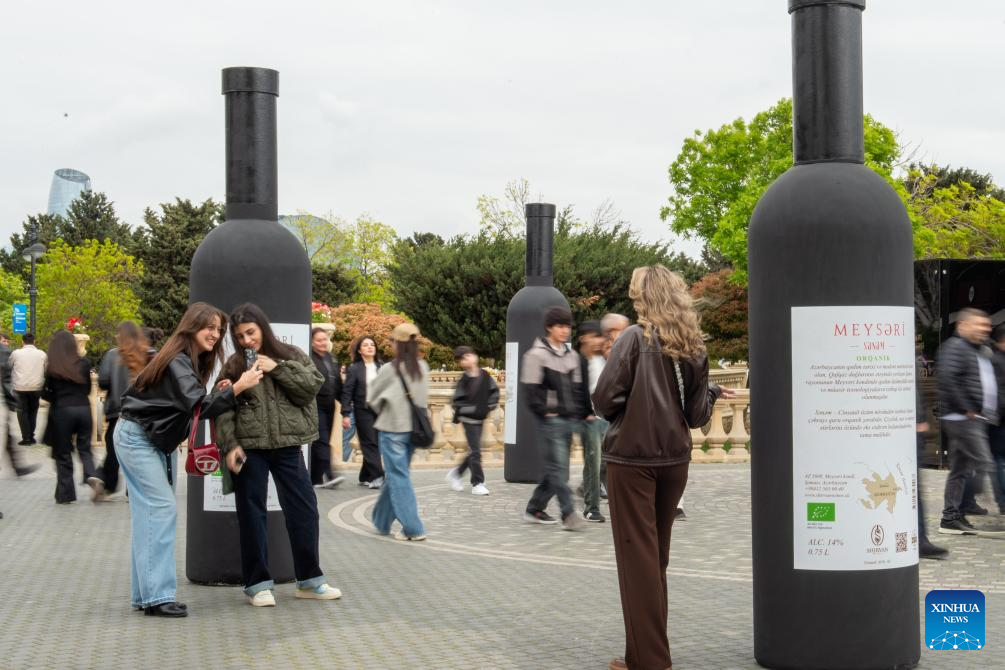 A woman poses for photos with a giant wine bottle installation during the Jazz and Wine Festival at a seaside park in Baku, Azerbaijan, April 25, 2026. The ten-day event integrates Azerbaijan's indigenous wine-making traditions with musical art, bringing a relaxing and vibrant vibe to the city and drawing numerous locals and tourists for leisure and wine tasting. (Xinhua/Chen Junfeng)