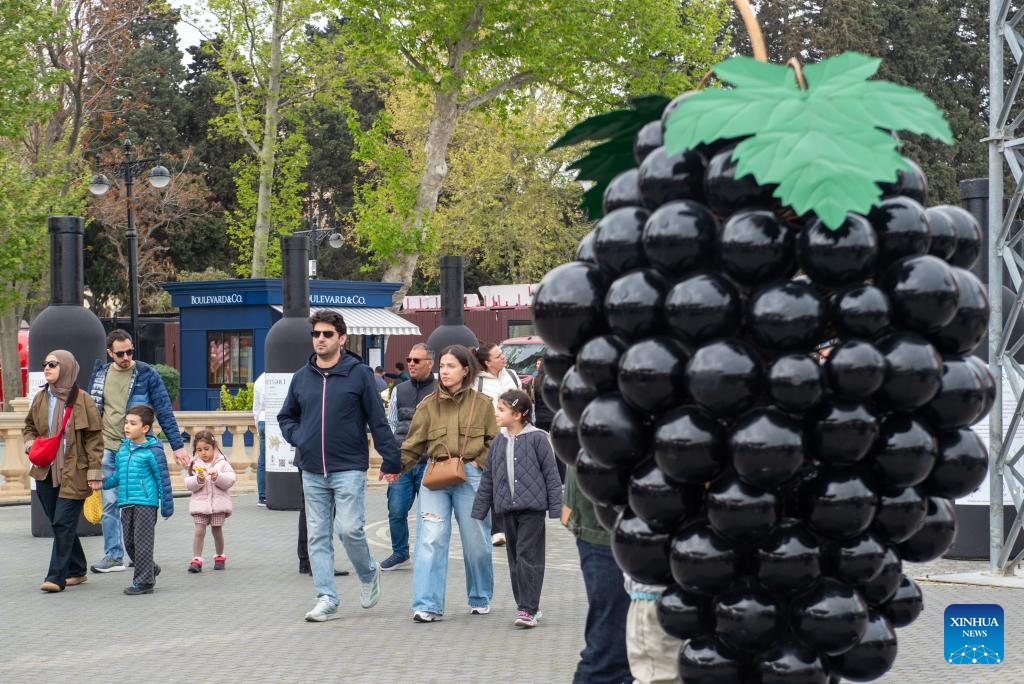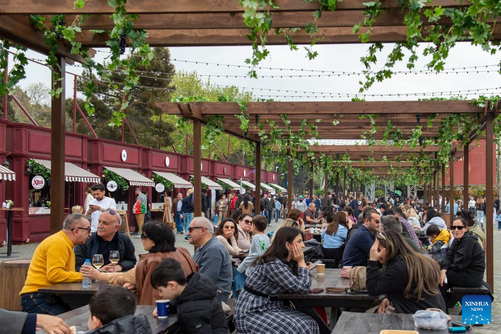 People attend the Jazz and Wine Festival at a seaside park in Baku, Azerbaijan, April 25, 2026. The ten-day event integrates Azerbaijan's indigenous wine-making traditions with musical art, bringing a relaxing and vibrant vibe to the city and drawing numerous locals and tourists for leisure and wine tasting. (Xinhua/Chen Junfeng)