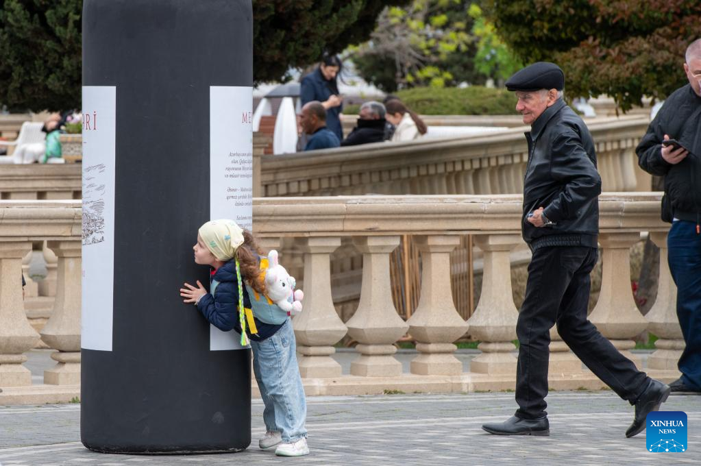 A girl hides behind a giant wine bottle installation as she plays hide-and-seek with adults during the Jazz and Wine Festival at a seaside park in Baku, Azerbaijan, April 25, 2026. The ten-day event integrates Azerbaijan's indigenous wine-making traditions with musical art, bringing a relaxing and vibrant vibe to the city and drawing numerous locals and tourists for leisure and wine tasting. (Xinhua/Chen Junfeng)