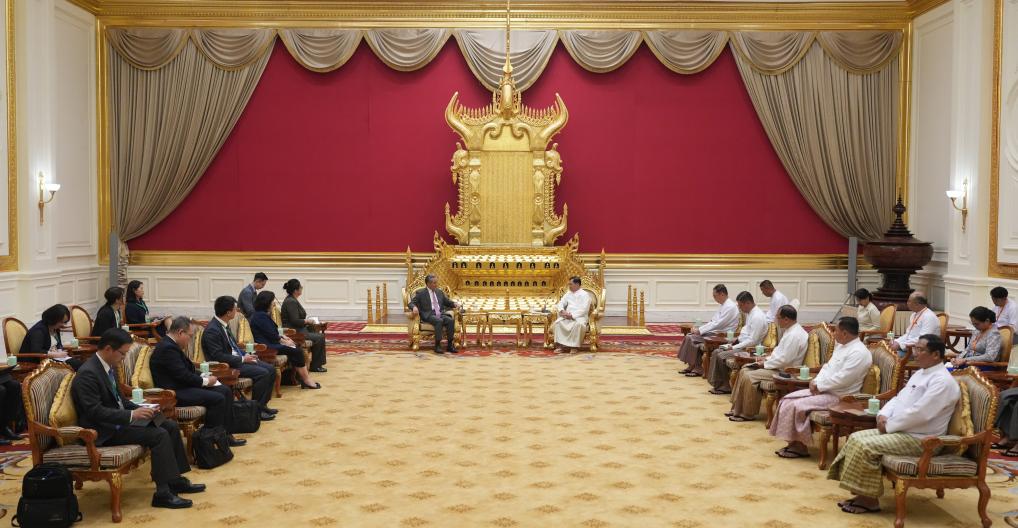 Myanmar's new President U Min Aung Hlaing meets with Wang Yi, a member of the Political Bureau of the Communist Party of China Central Committee and Chinese foreign minister, in Nay Pyi Taw, Myanmar, April 25, 2026. (Xinhua/Li Guangtao)