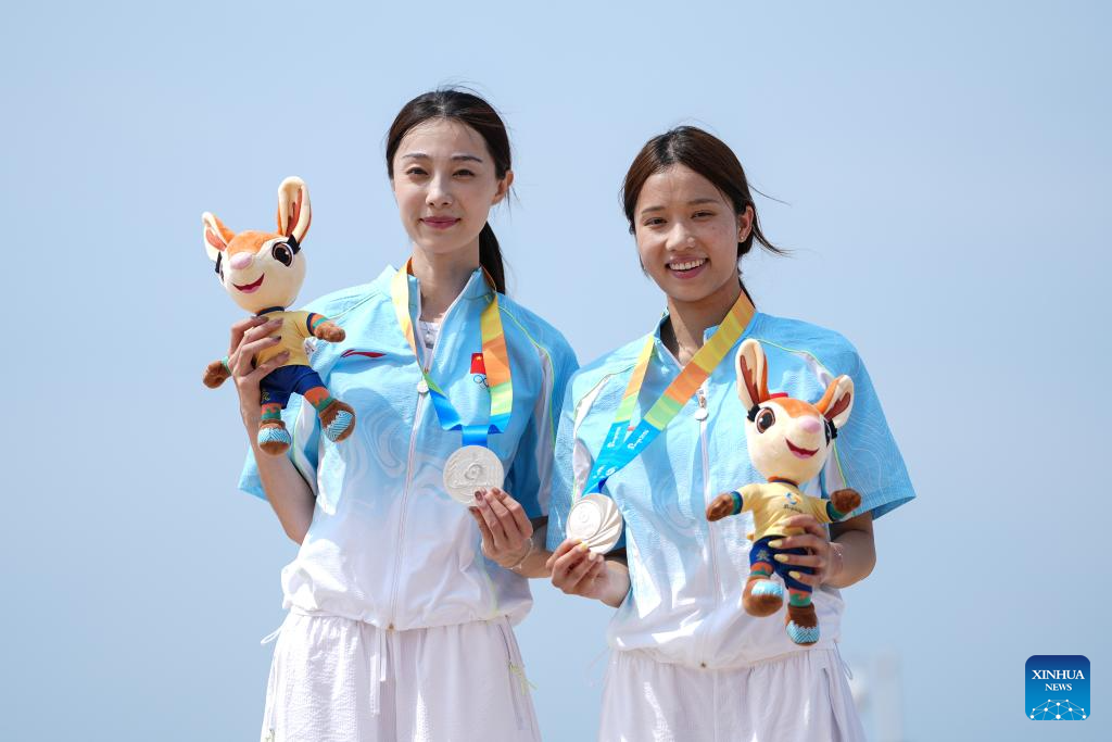 Silver medalists Hu Linpeng (L) and Shao Yuqi of China pose for photos during the awarding ceremony of the women's high jump of beach athletics at the 6th Asian Beach Games in Sanya, south China's Hainan Province, April 26, 2026. (Xinhua/Pan Yulong)
