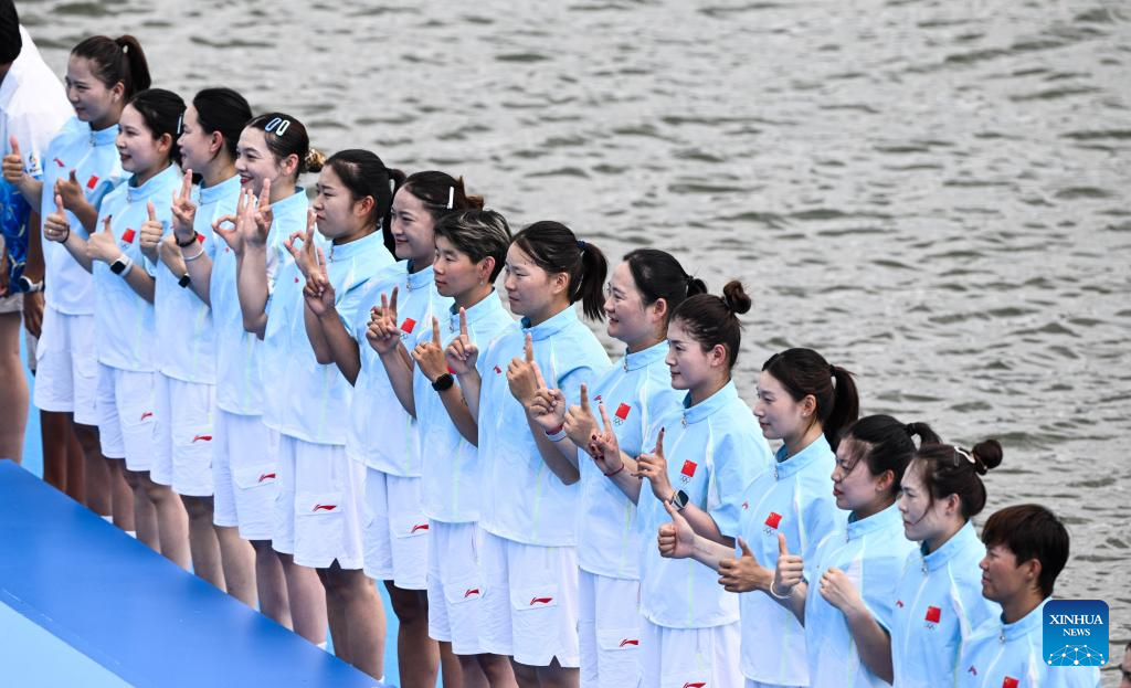 Team China (bottom) celebrates after the grand final of small boat women's 400m straight race of dragon boat event at the 6th Asian Beach Games in Sanya, south China's Hainan Province, April 26, 2026 (Xinhua/Yang Guanyu)