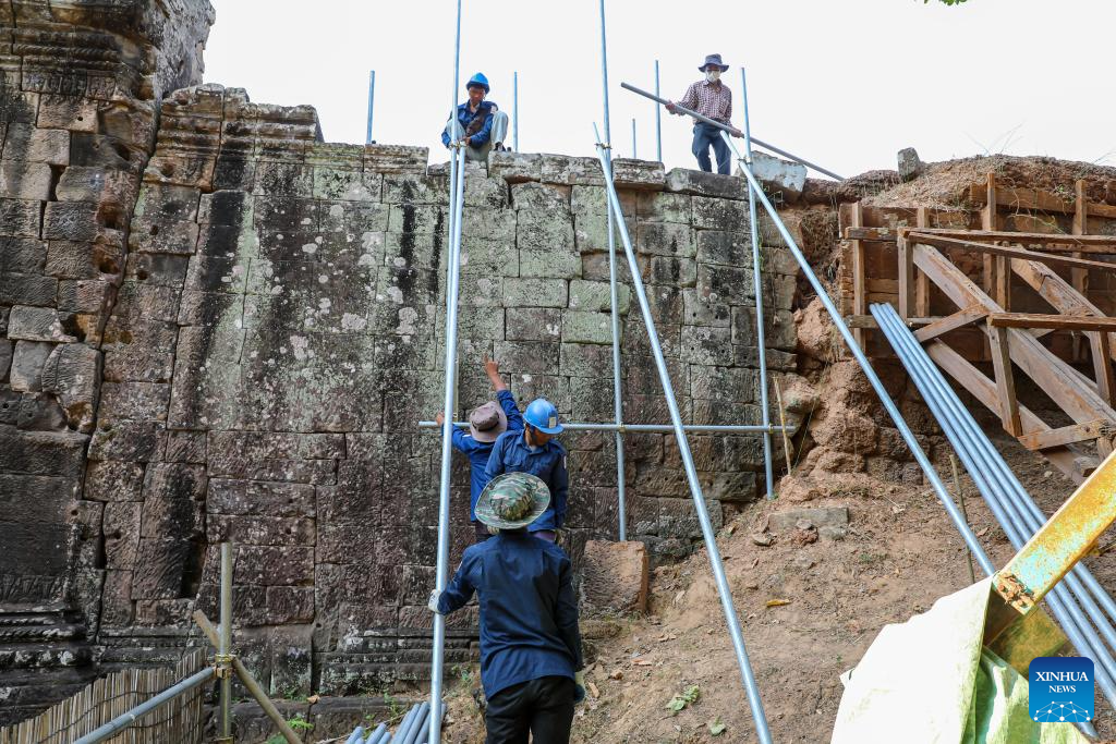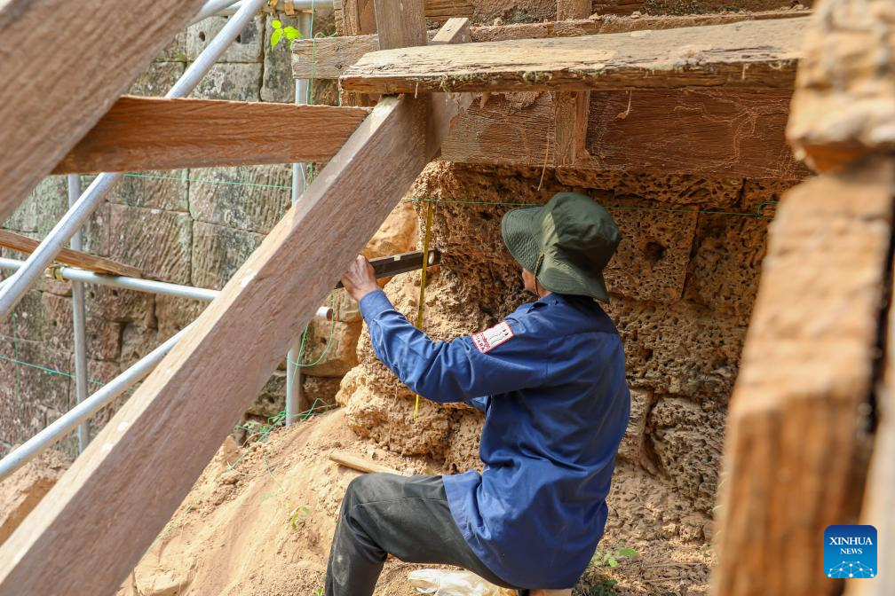 PHNOM PENH, April 27 (Xinhua) -- An archaeological team has been restoring the laterite wall of the centuries-old Angkor Thom in the UNESCO-listed Angkor Archaeological Park in northwest Cambodia's Siem Reap province, said a news release from the APSARA National Authority (ANA) on Monday.