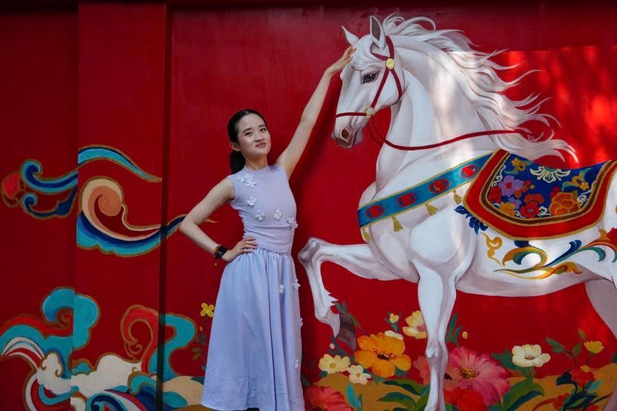 Chinese American Sherry Zhu poses for photos at Cuihu Lake park in Kunming, southwest China's Yunnan Province, April 24, 2026. (Xinhua/Chen Xinbo)Chinese American Sherry Zhu poses for photos with a horse wall painting by Cuihu Lake in Kunming, southwest China's Yunnan Province, April 24, 2026. (Xinhua/Chen Xinbo)