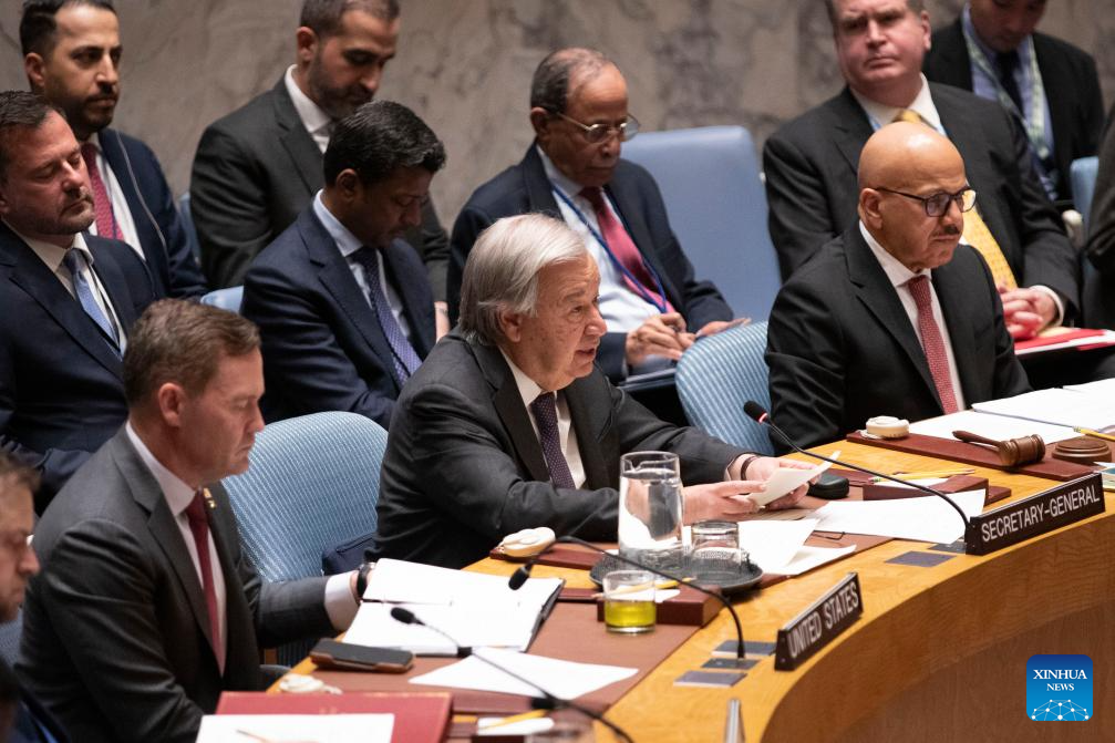 UN Secretary-General Antonio Guterres (C, front) speaks during the UN Security Council open debate on the safety and protection of waterways in the maritime domain, at the UN headquarters in New York, April 27, 2026. UN Secretary-General Antonio Guterres on Monday called for the reopening of the Strait of Hormuz at a Security Council open debate on the safety and protection of waterways in the maritime domain. (Xinhua/Xie E)