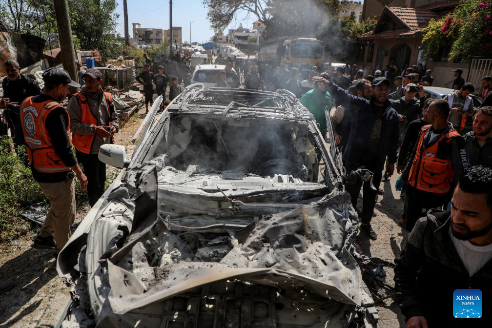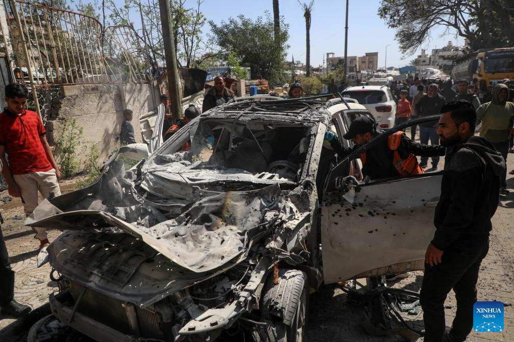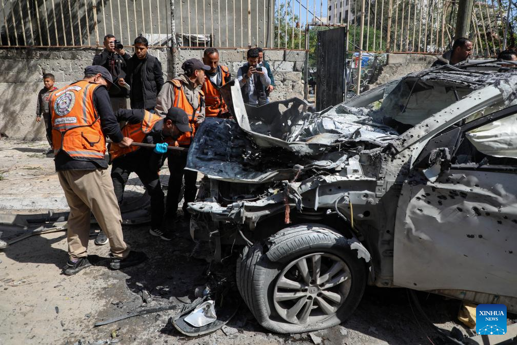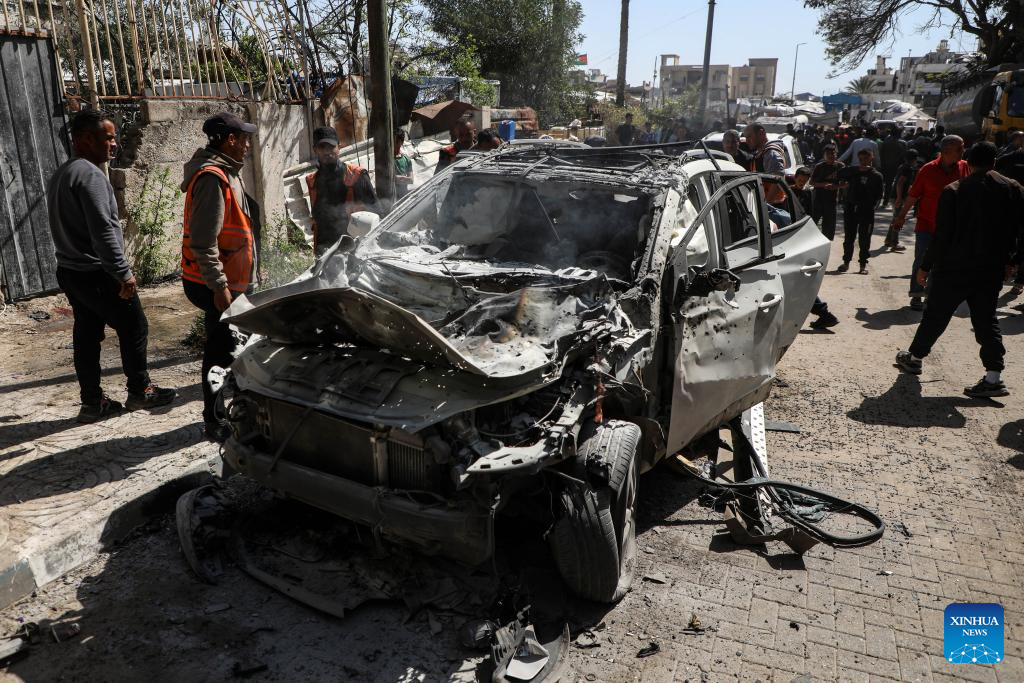 Palestinians inspect a destroyed vehicle after an Israeli airstrike in Gaza City, April 28, 2026. (Photo by Rizek Abdeljawad/Xinhua)
