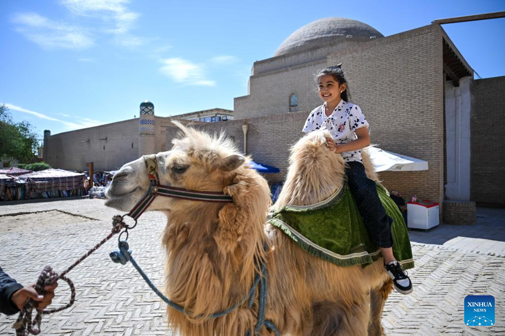 A girl rides a camel in the ancient city of Khiva, Uzbekistan, on April 26, 2026. As one of the ancient cities situated along the Silk Road, Khiva has been a center of education, science and culture, and served as a cradle of civilizations spanning millennia, with Ichan Kala, the inner city of the ancient oasis of Khiva, added to the UNESCO World Heritage List in 1990. (Xinhua/Li Renzi)