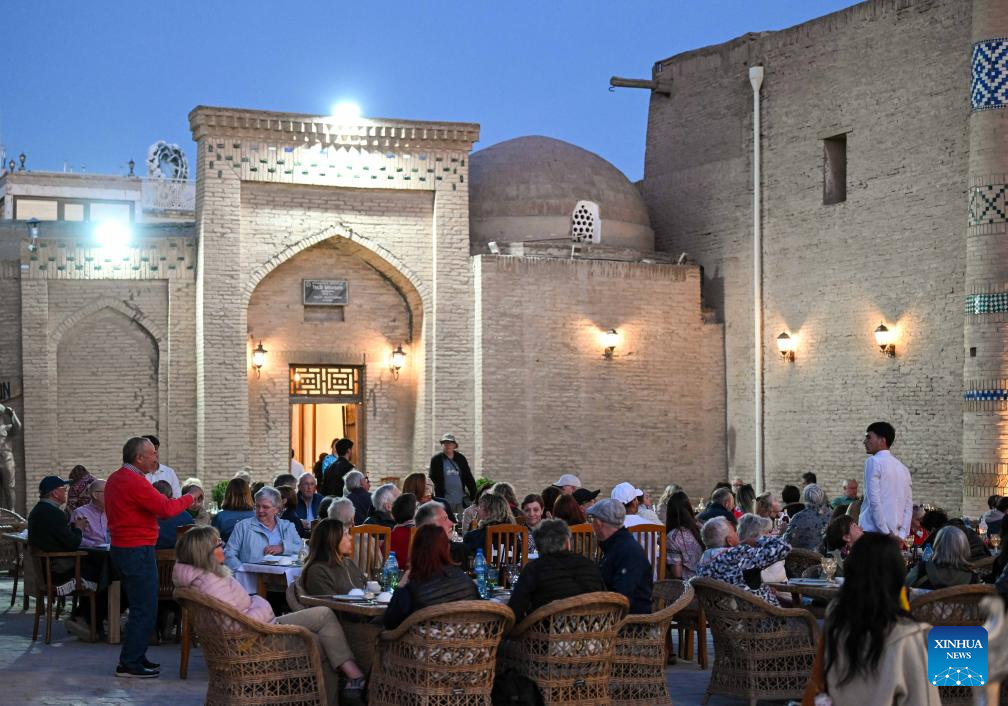 People have dinner at a restaurant in the ancient city of Khiva, Uzbekistan, on April 26, 2026. As one of the ancient cities situated along the Silk Road, Khiva has been a center of education, science and culture, and served as a cradle of civilizations spanning millennia, with Ichan Kala, the inner city of the ancient oasis of Khiva, added to the UNESCO World Heritage List in 1990. (Xinhua/Li Renzi)
