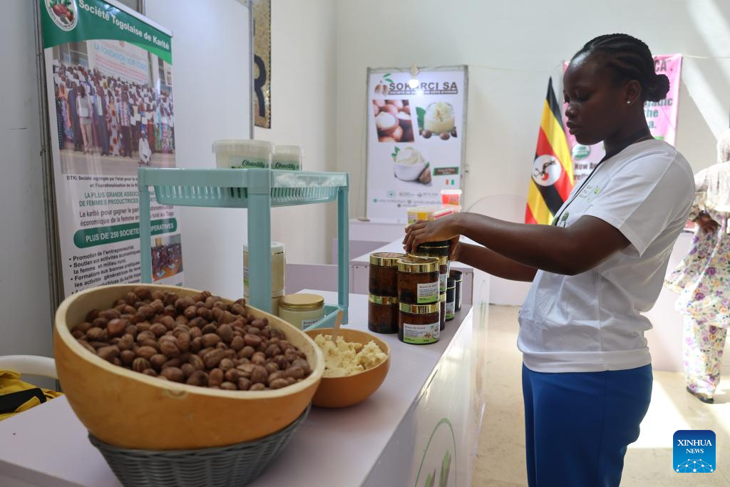 An exhibitor displays shea products at the Shea 2026 conference in Accra, Ghana, April 28, 2026. (Photo by Seth/Xinhua)