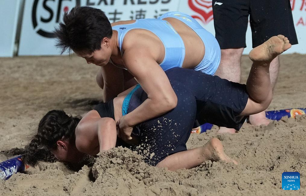 Xie Mengyu (R) of China competes with Nguyen Thi My Hanh of Vietnam during their beach wrestling women's 60kg semifinal at the 6th Asian Beach Games in Sanya, south China's Hainan Province, April 28, 2026. (Xinhua/Hu Jingwen)
