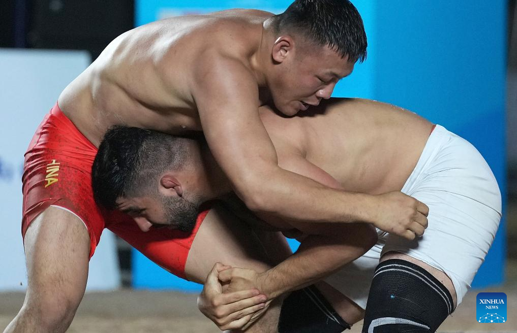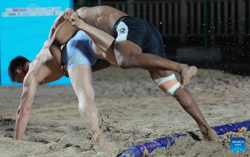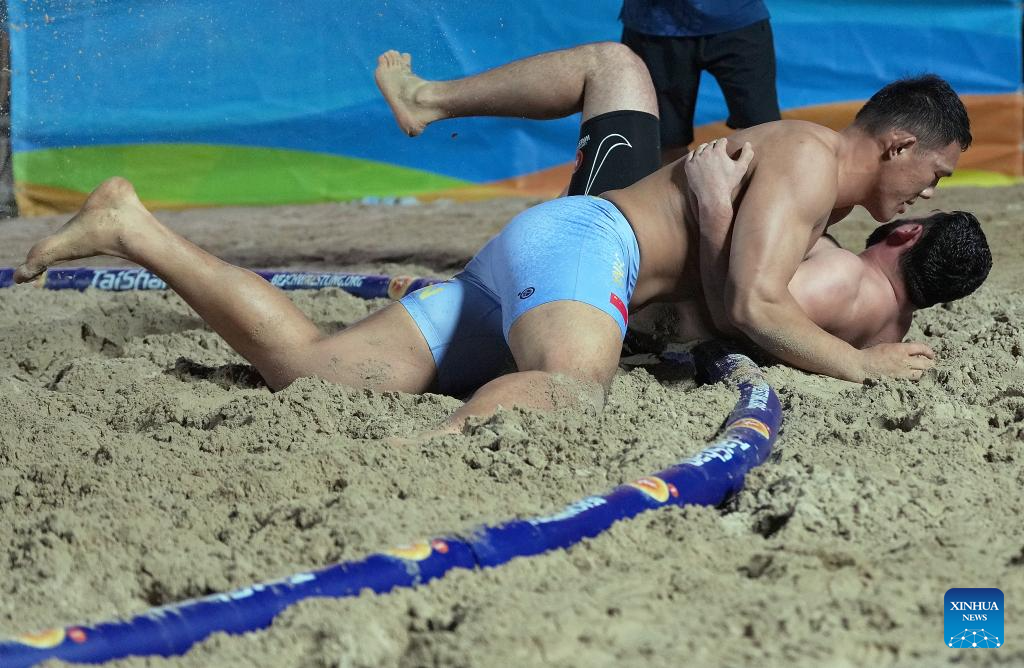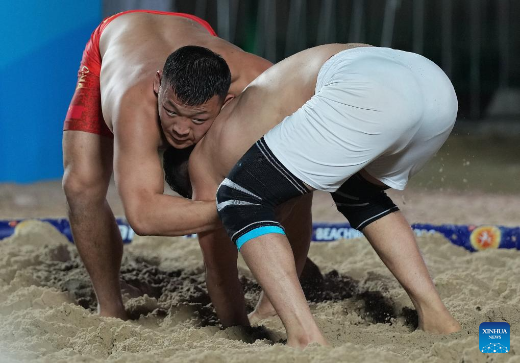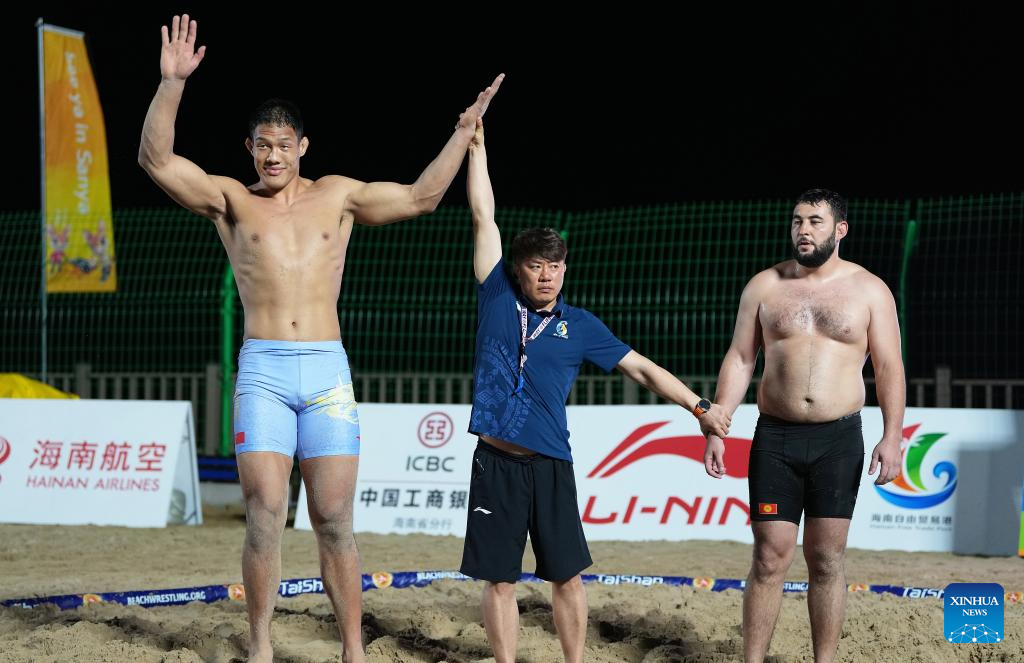 Lu Da (top) of China competes with Muzafar Alimovich Zhappuev of Kyrgyzstan during their beach wrestling men's +90kg semifinal at the 6th Asian Beach Games in Sanya, south China's Hainan Province, April 28, 2026. (Xinhua/Hu Jingwen)
